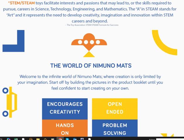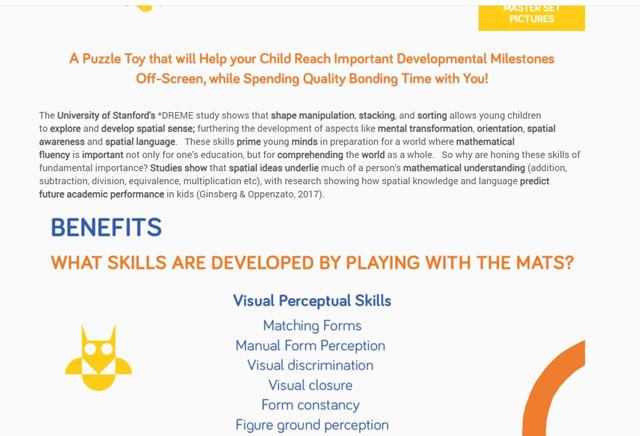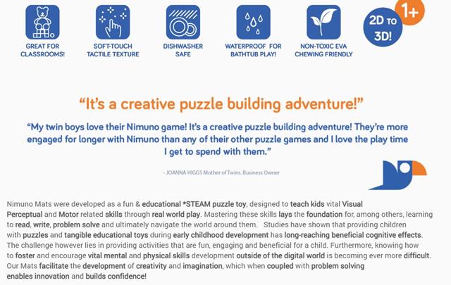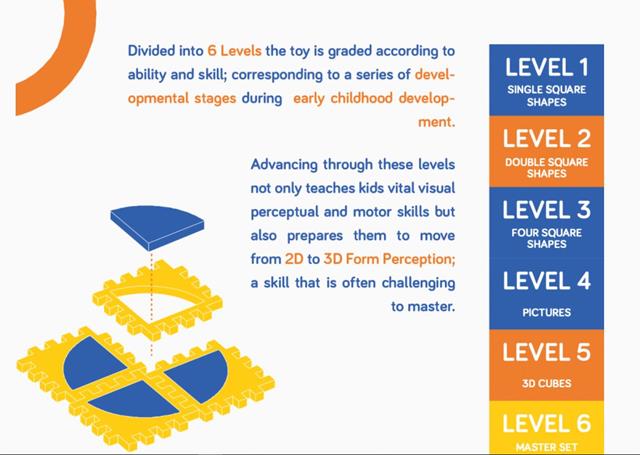 Nimuno Mats is an educational puzzle toy designed to teach kids vital visual perceptual and motor skills necessary to advance through varying developmental stages as they grow. This combination of skills lays the foundation for, amongst others, learning to read, write, and ultimately navigate the world of objects around them. Watch your child learn and grow as they advance through these levels; finally moving from 2D to 3D.